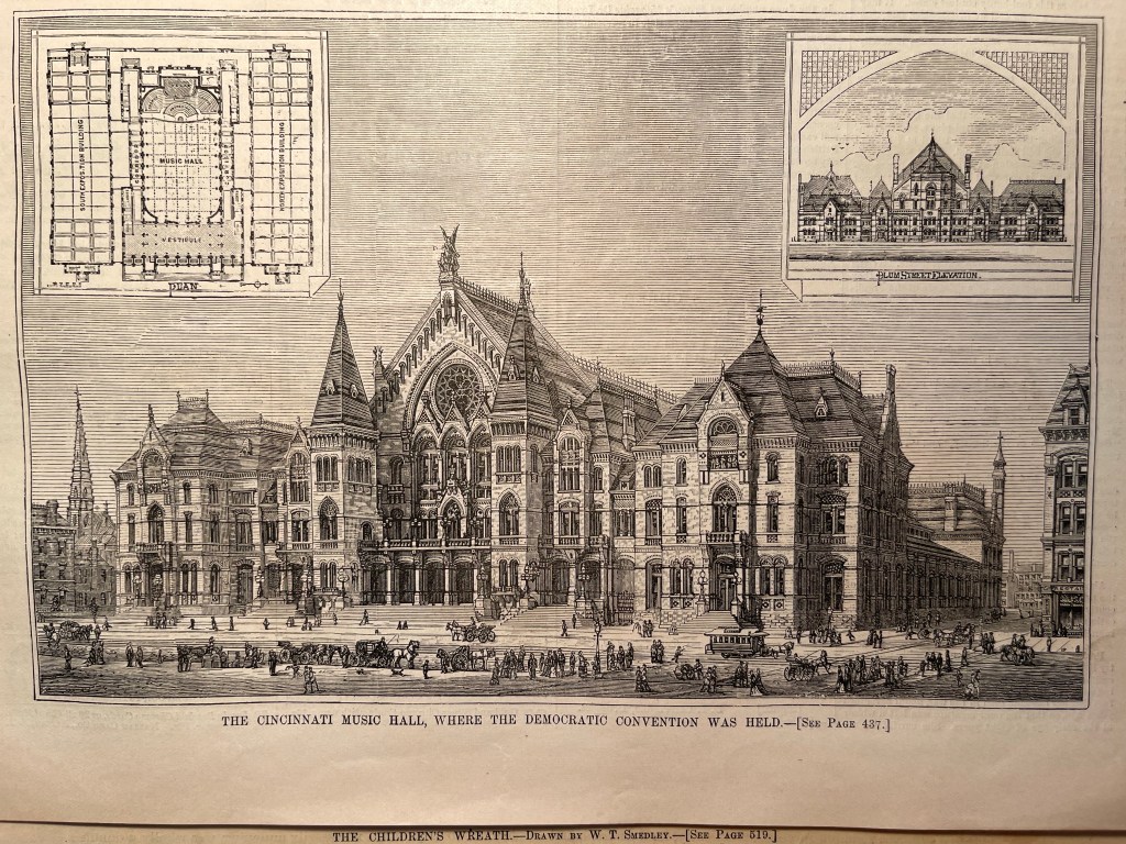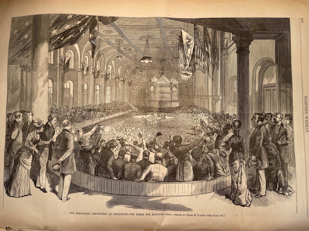 One wouldn’t know it from the way the Democrats celebrated their man. In Cincinnati, Ohio, at Music Hall, the Democratic Party held their convention to decide the nominee for the election of 1880. At the convention, the votes started to turn to Hancock, and as that happened during the third and final day of the Democratic Convention, the “Hancock banner was waving and advancing to the front” with the band “playing ‘Dixie’ and ‘Hail to the Chief,’ and the delegates were cheering and howling like lunatics.”[vii] New Jersey moved its votes to Hancock, then Pennsylvania, and when Ohio moved its votes, the two-thirds majority was met: the “scene was then one of the wildest uproar. All the State banners were waving and being massed in front. There was continuous shouting and cheering, and the band and great organ added to the din. The chairman, after vainly trying to restore order, refused to recognize anybody until the confusion had been subdued.”[viii]