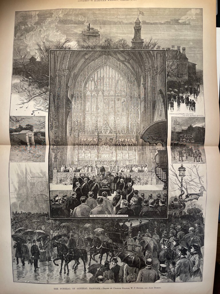 The funeral service was in New York’s Trinity Church, and people filled the church and the streets. And, at a time when such a thing was the ultimate sending off, a funeral train departed with Hancock’s body from Jersey City, New Jersey to the final resting place in Pennsylvania. He was one icon of the age, and it was a time when America was changing; it was moving past the Civil War era. The generation that had given the nation its second birth was passing the country onto the next generation. Generals Grant, Hancock, and McClellan had died within the year.[xvii] The country was “leaving a great era of our history behind us” and was bringing the country to a new era: “we are already confronted with new times, new issues, and new men.”[xviii]